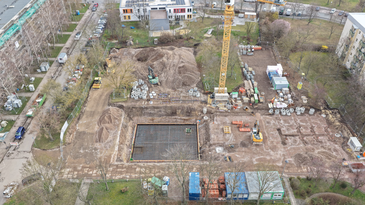 Am Alfred-Delp-Ring schreiten die Arbeiten mit sichtbarem Fortschritt voran. Im Haus 2 konnte die Bodenplatte des Kellergeschosses bereits bewehrt werden, sodass die Betonage in Kürze erfolgen kann. Auch in Haus 1 laufen die ersten vorbereitenden Maßnahmen für den Beginn der Rohbauarbeiten.