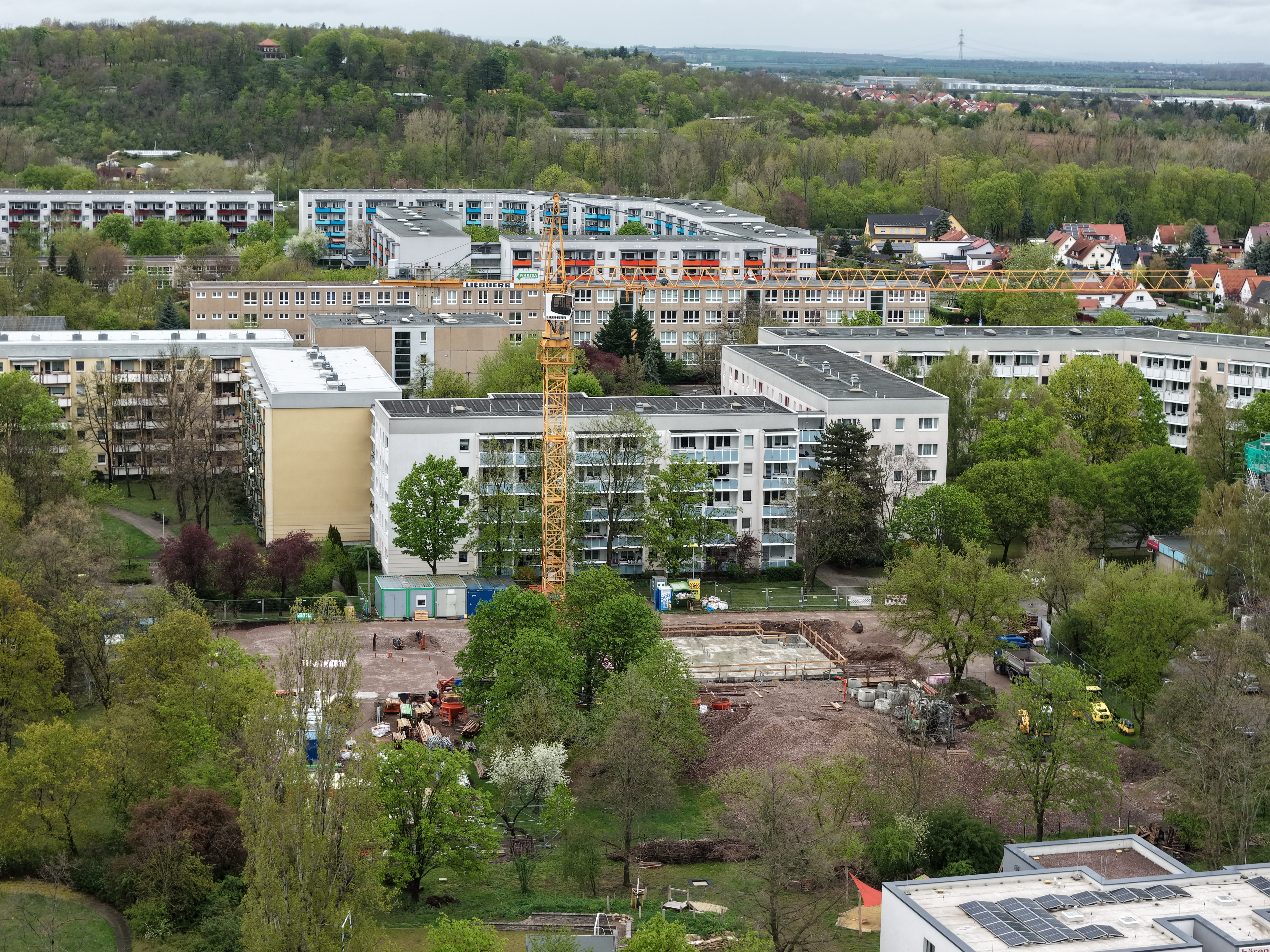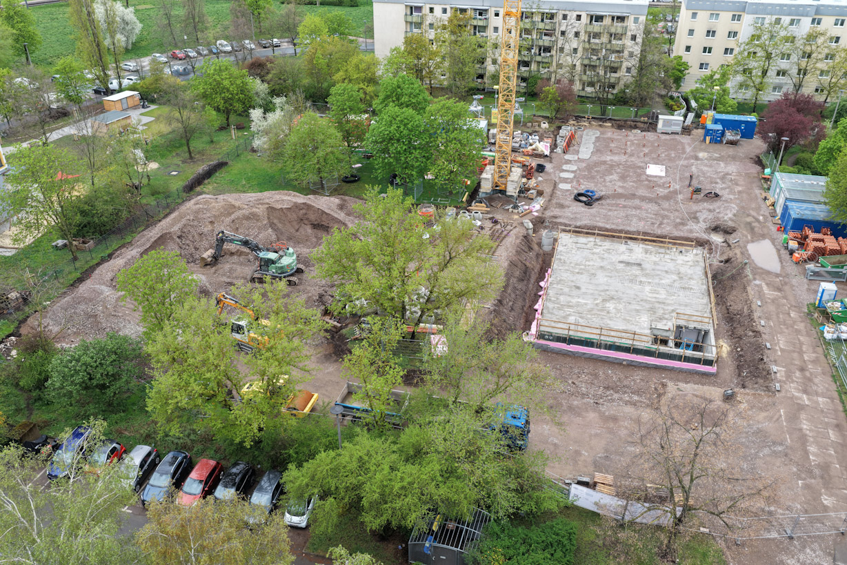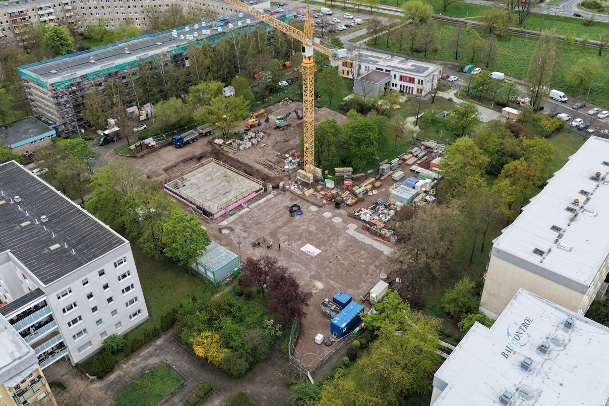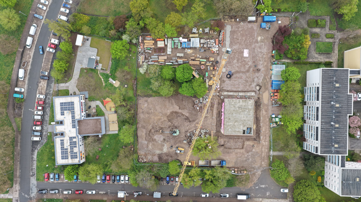Auch im Projekt Alfred-Delp-Ring macht sich der Frühling inzwischen bemerkbar und sorgt rund um die Baustelle für ein zunehmend grünes Umfeld. In den vergangenen Wochen konnte das Kellergeschoss des Hauses 2 fertiggestellt werden. Im nächsten Schritt kann nun die Baugrube verfüllt und mit den Arbeiten am Erdgeschoss begonnen werden. In diesem Zusammenhang werden auch die ersten Holzrahmenwände geliefert und montiert. Gleichzeitig dazu laufen die Ausschreibungen und Vergaben weiterer Gewerke, darunter Innenputz und Trockenbau, planmäßig weiter.