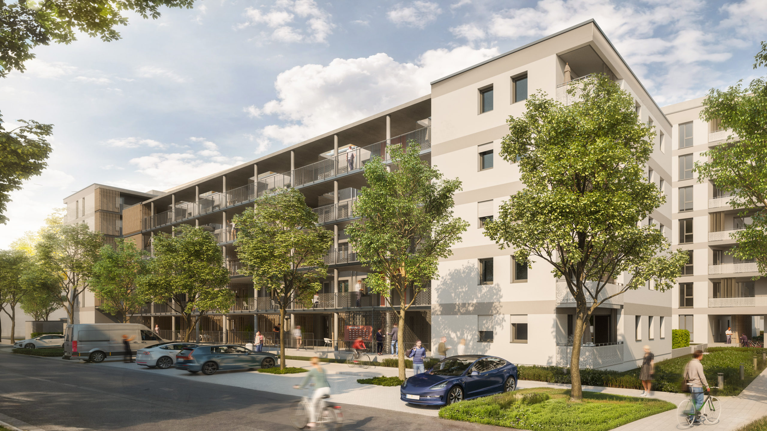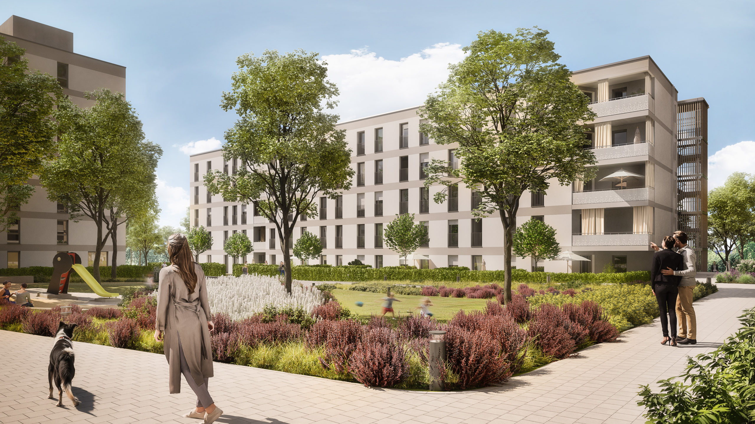 - Kinderspielplatz und begrünte Innenhöfe fördern generationsübergreifende Begegnung und schaffen Lebensqualität