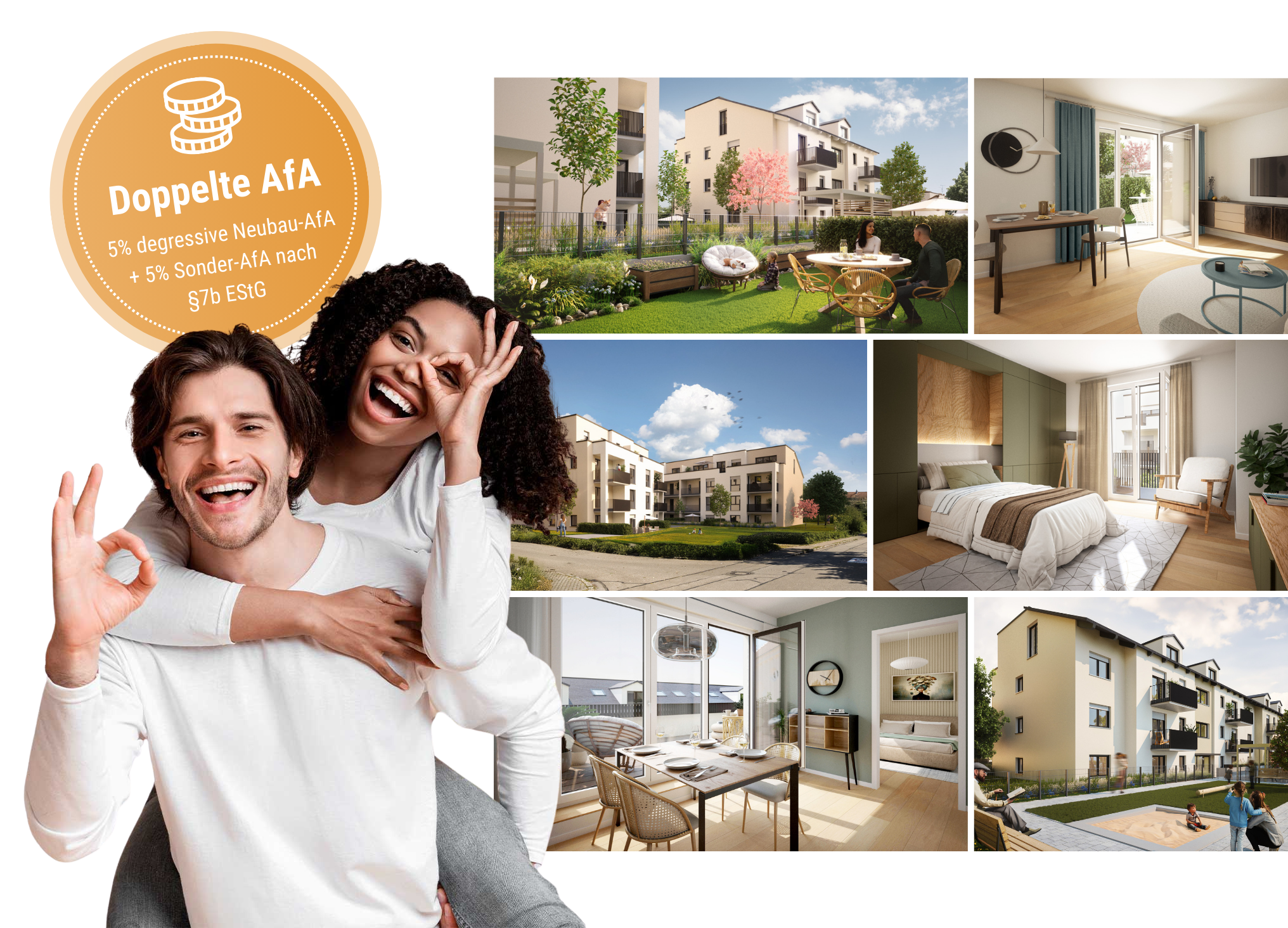 Wohnungen teilw. mit Loggia oder Terrasse, inkl. Einbauküche, Smart-Home, 5 % degressive AfA , 5% Sonder-AfA nach § 7b EStG, zinsvergünstigtes KfW-Darlehen bis 150.000 € möglich (Programm 298)